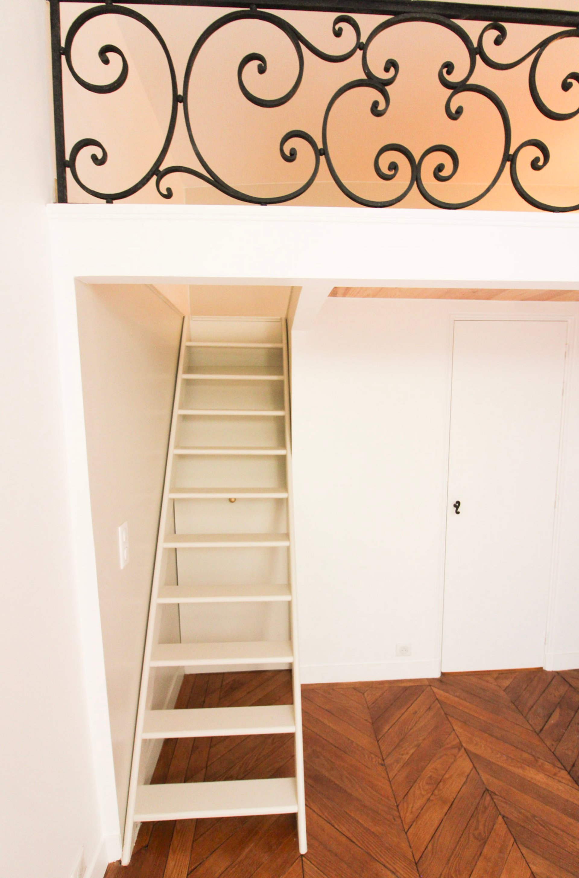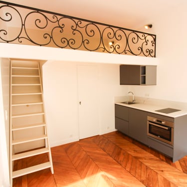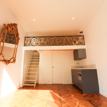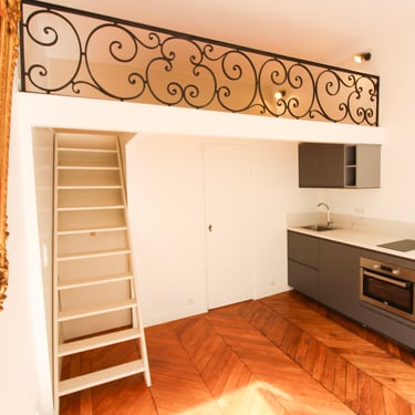 Le parquet point de hongrie et le garde de corps en ferronerie d'époque (éléments récupérés sur un chantier) donnent chaleur et cachet à ce studio.