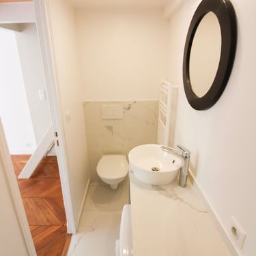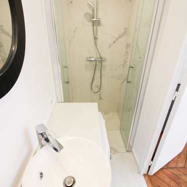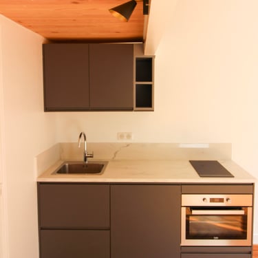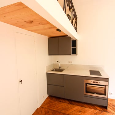 Cet ancien garage situé dans la cour d'un immeuble hausmanien a été transformé en studio d'habitation, en y intégrant une cuisine et une salle de bain aux volumes optimisés.