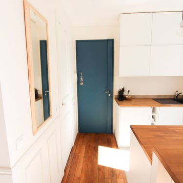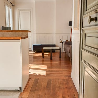 Des moulures murales et des corniches de plafond ont été ajoutées pour retrouver l'esprit classique de cet appartement situé dans un immeuble Haussmannien.