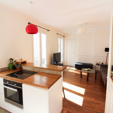 Les cloisons ont été déposées, notamment pour redéfinir et optimiser les espaces cuisine et salle de bain. Les sols ont été repris avec du parquet d'époque.